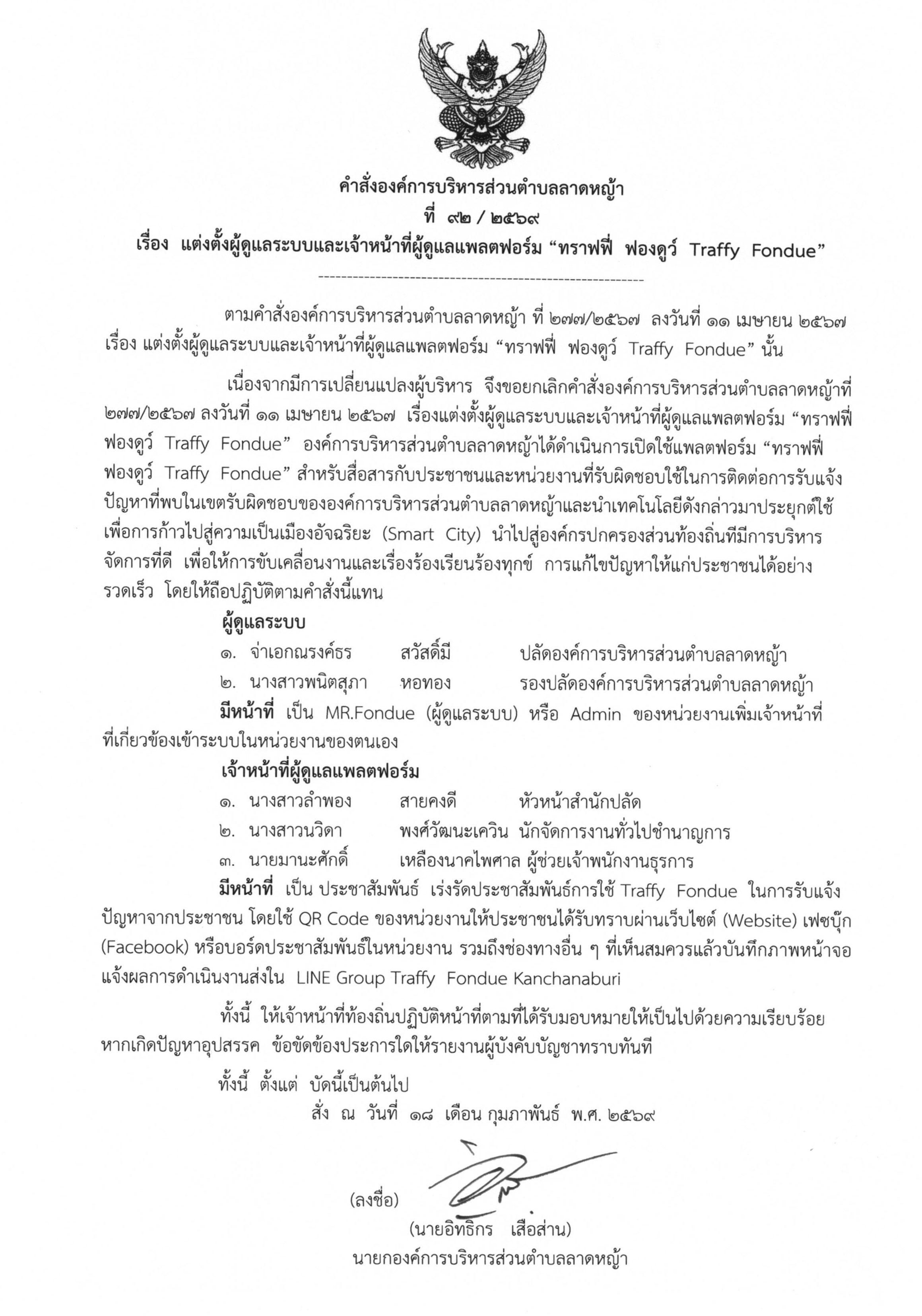 คำสั่งที่ 92/2569 เรื่อง แต่งตั้งผู้ดูแลระบบและเจ้าหน้าที่ผู้ดูแลแพลตฟอร์ม "ทราฟฟี่ Traffy Fondue"