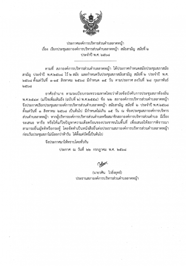 ประกาศ เรียกประชุมสภาองค์การบริหารส่วนตำบลลาดหญ้า สมัยสามัญ สมัยที่ 2 ประจำปี 2568