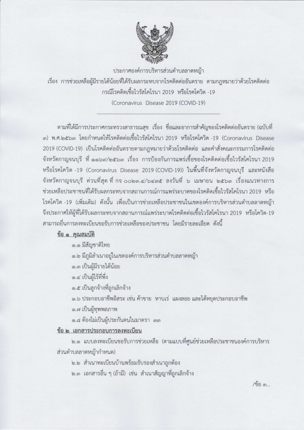 ประกาศ อบต.ลาดหญ้า เรื่องการช่วยเหลือผู้มีรายได้น้อยที่ได้รับผลกระทบจากโรคติดเชื้อไวรัสโคโรนา 2019