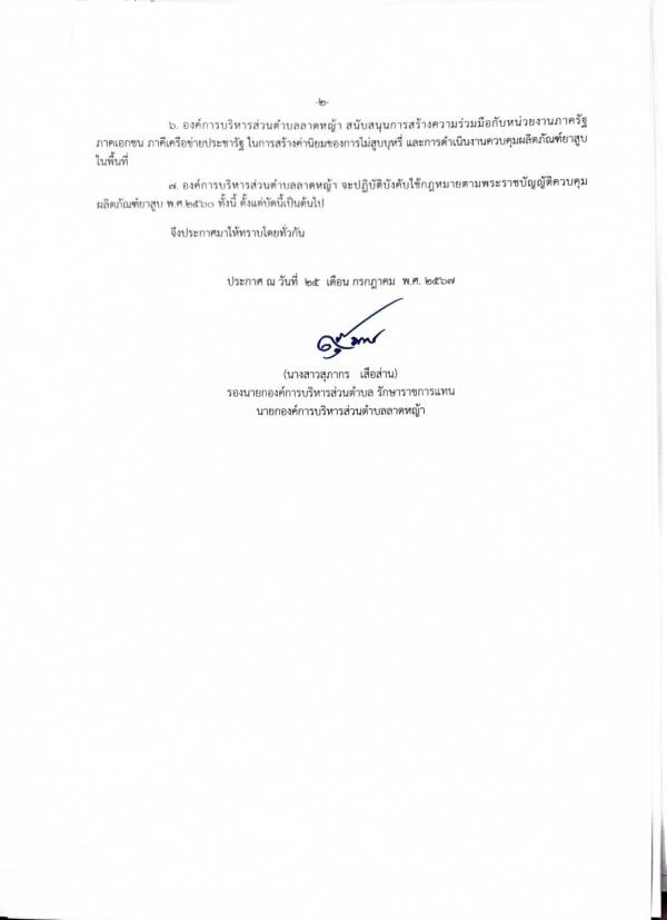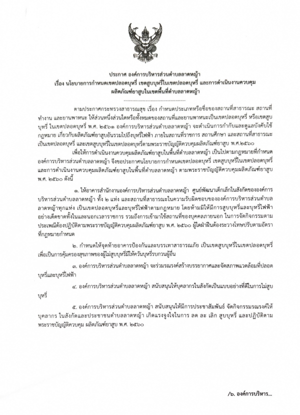 ประกาศ เรื่อง นโยบายการกำหนดเขตปลอดบุหรี่ เขตสูบบุหรี่ในเขตปลอดบุหรี่ และการดำเนินงานควบคุมผลิตภัณฑ์ยาสูบในเขตพื้นที่ตำบลลาดหญ้า