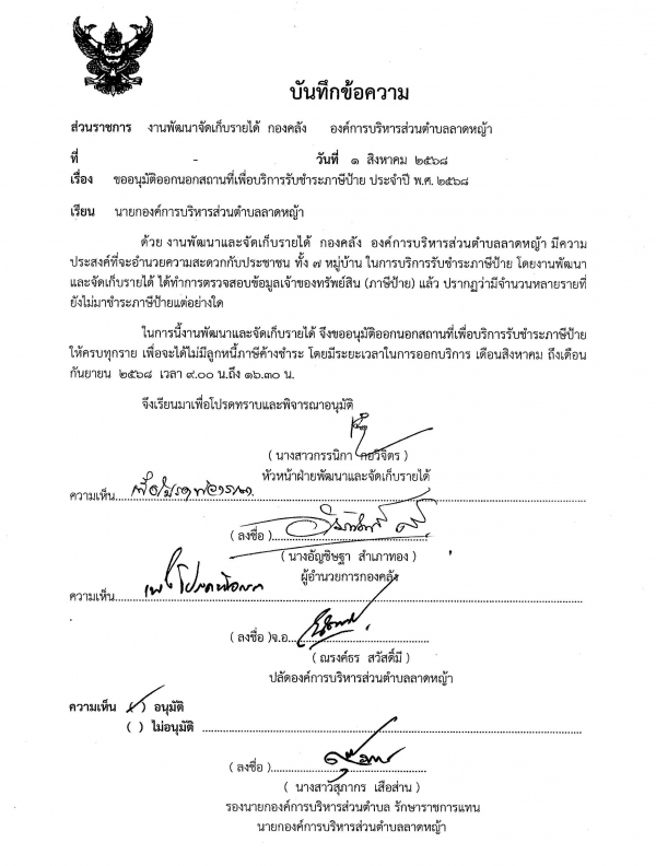 ขออนุมัติออกนอกสถานที่เพื่อบริการรับชำระภาษีป้าย ประจำปี พ.ศ.2568
